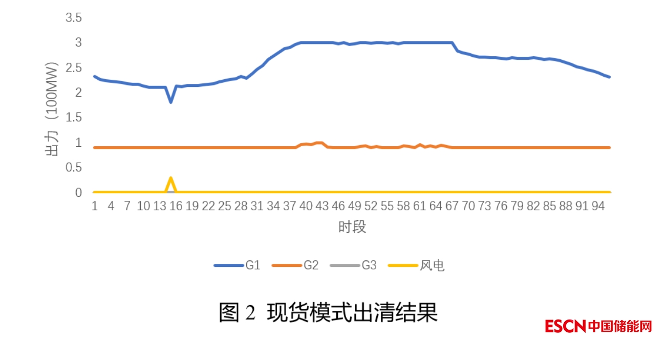 模式3:調(diào)峰市場(chǎng)與現(xiàn)貨市場(chǎng)共存模式。在該模式中,機(jī)組現(xiàn)貨市場(chǎng)報(bào)價(jià)首段出力限制為50%,50%-30%為深調(diào)峰市場(chǎng)競(jìng)價(jià)部分,火電機(jī)組50%以下出力不得參與定價(jià),深調(diào)峰市場(chǎng)中標(biāo)機(jī)組在中標(biāo)時(shí)段設(shè)置為開機(jī),發(fā)電出力為現(xiàn)貨市場(chǎng)中中標(biāo)出力(若在現(xiàn)貨市場(chǎng)未中標(biāo),按照50%最大出力計(jì)算)減去調(diào)峰市場(chǎng)中標(biāo)的調(diào)峰出力。市場(chǎng)出清結(jié)果如圖3所示,G3會(huì)在15時(shí)段的深調(diào)市場(chǎng)中標(biāo)30兆瓦,所以在后續(xù)的電能量市場(chǎng)中被設(shè)置為開機(jī),且除去調(diào)峰中標(biāo)時(shí)段外,其他時(shí)段出力均為50%的最大出力,導(dǎo)致G2只能處于停機(jī)狀態(tài),使得總發(fā)電成本進(jìn)一步上升。在調(diào)峰市場(chǎng)與現(xiàn)貨市場(chǎng)共存模式下,由風(fēng)電企業(yè)向G3機(jī)組支付產(chǎn)生的75萬元調(diào)峰費(fèi)用,用戶需要支付的發(fā)電總成本為240.64萬元,雖然解決了棄風(fēng)問題,但是使得發(fā)電總成本上漲35.70萬元,扭曲了市場(chǎng)中電力的真正價(jià)格,引起用戶購(gòu)電費(fèi)用的同步上漲。