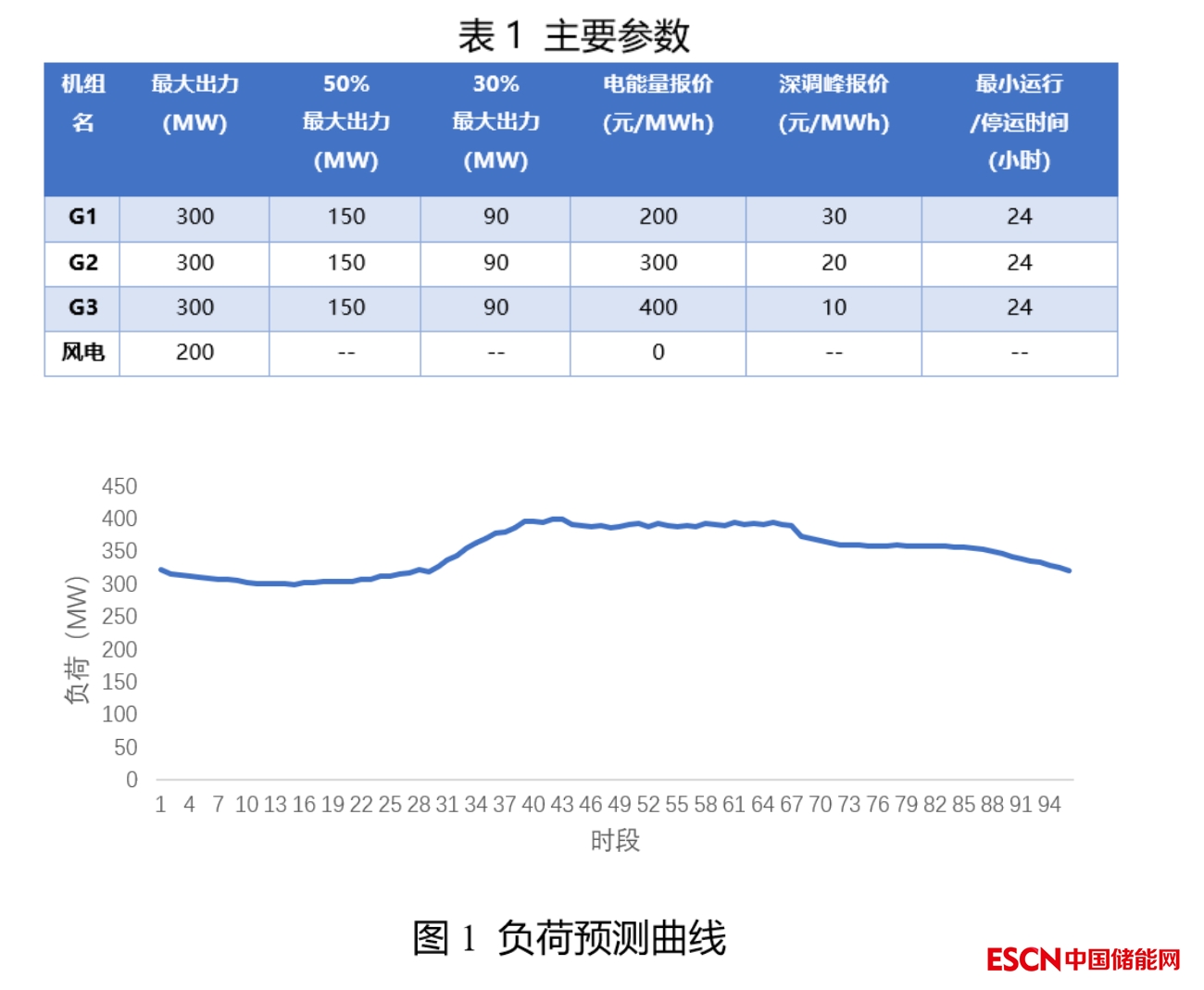 在該模型中,第15時(shí)段為最小負(fù)荷300兆瓦,第42時(shí)段為最大負(fù)荷399.8兆瓦,并假設(shè)風(fēng)電出力30兆瓦只發(fā)生在15時(shí)段。