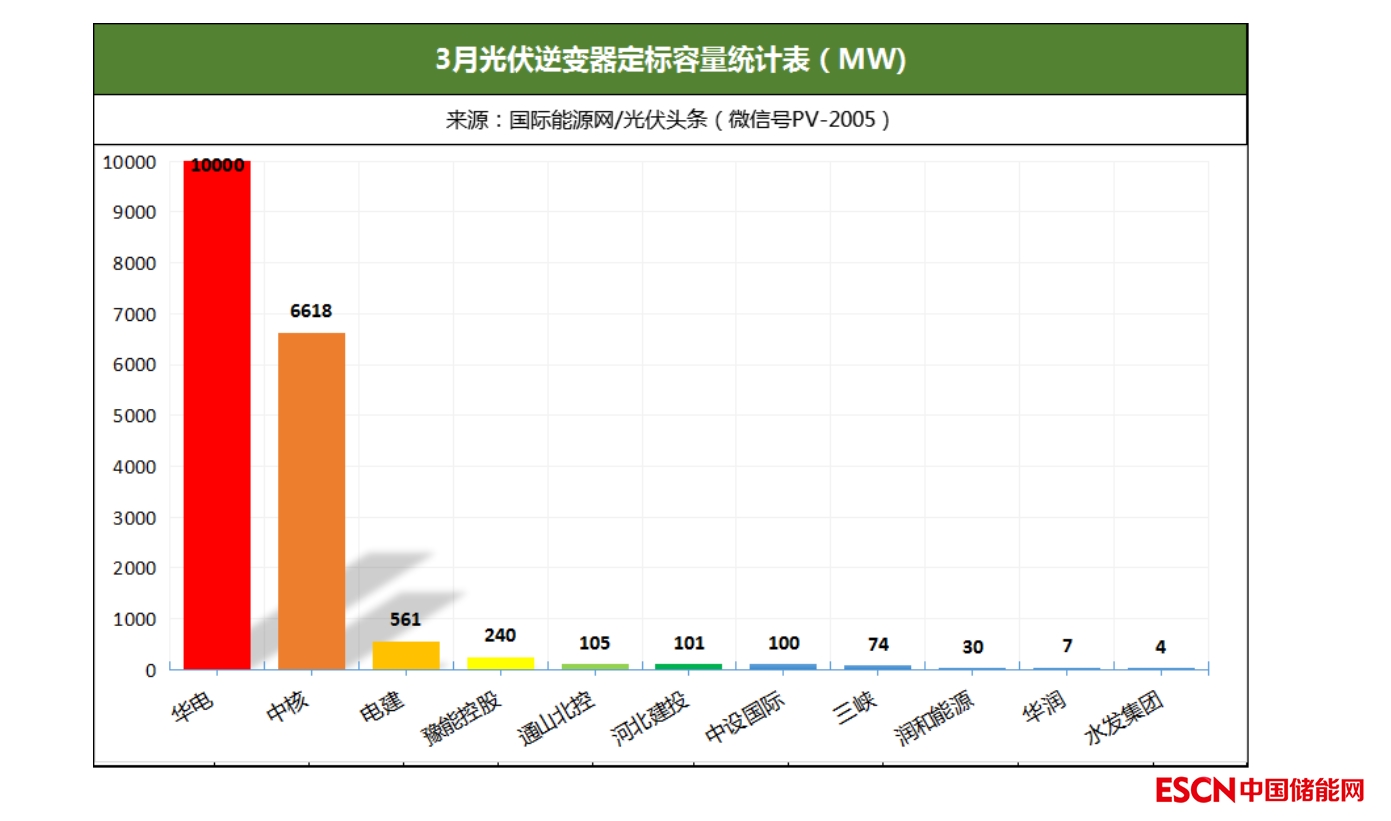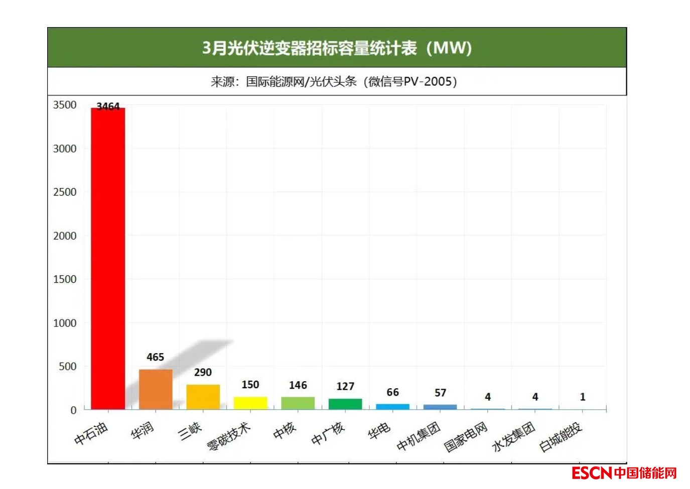 3月逆變器招投標(biāo)市場除央國企集采項目之外,其他企業(yè)針對具體項目的招標(biāo)相比前兩月不論是項目數(shù)量還是項目規(guī)模都略有上升。國際能源網(wǎng)/光伏頭條(PV-2005)統(tǒng)計3月,中石油、華潤、三峽、中核、中廣核等企業(yè)發(fā)布了23個逆變器采購項目,合計容量約4.78GW