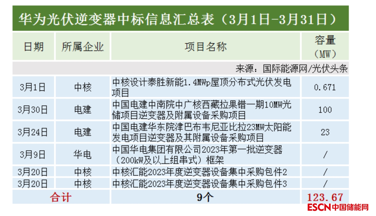 本統(tǒng)計周期,華為中標(biāo)中國電建、中核集團(tuán)、華電等企業(yè)9個項目(標(biāo)段),確定中標(biāo)容量123.67MW。