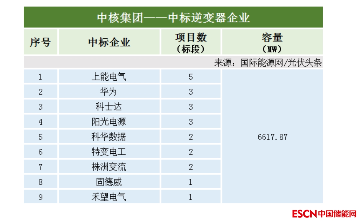 3月1日-3月31日,中核集團(tuán)有5個項目定標(biāo),確定定標(biāo)容量6617.86MW。其中,中核匯能2023年度逆變器設(shè)備集中采購,確定了中標(biāo)候選人。該集采項目采購容量6600MW,上能電氣、華為、科士達(dá)、陽光電源、科華數(shù)據(jù)、特變電工、株洲變流、固德威、禾望電氣等9家入圍。