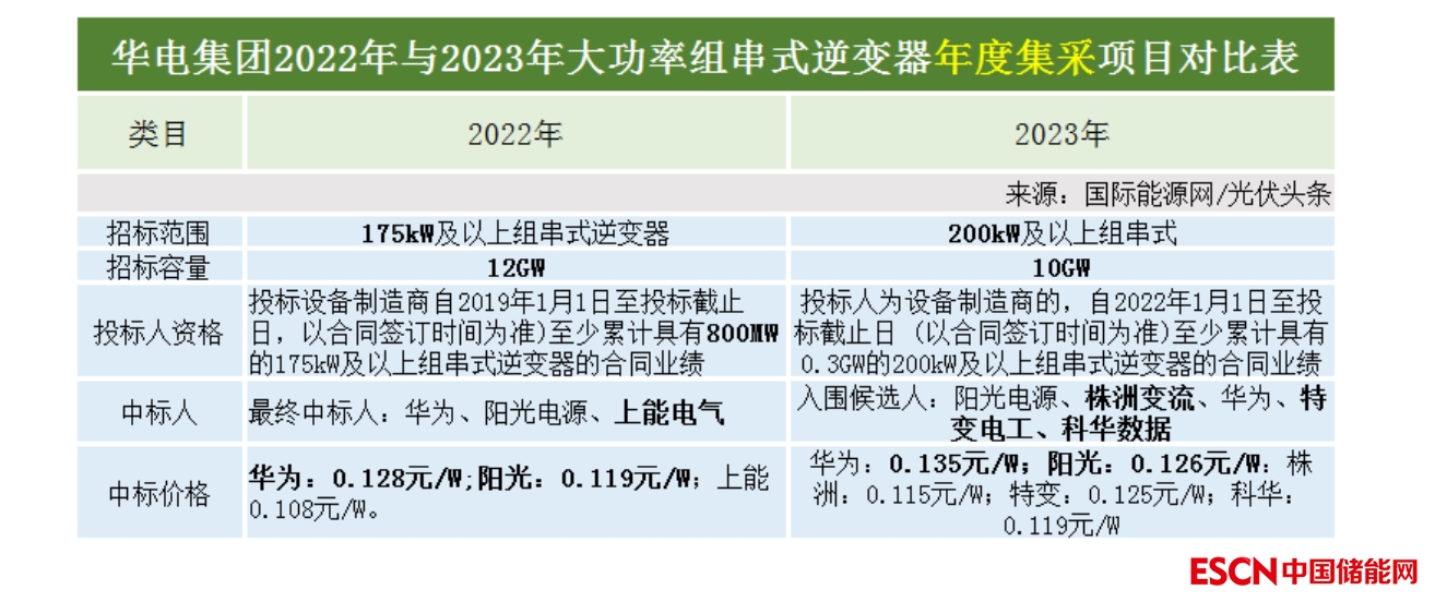 值得關(guān)注的是中國華電集團(tuán)有限公司2022年組串式逆變器框架采購標(biāo)段二同樣對175kW及以上組串式逆變器進(jìn)行集中采購,國際能源網(wǎng)/光伏頭條(PV-2005)通過對比2023與2022年大功率組串式逆變器的招中標(biāo)情況,發(fā)現(xiàn)華電大功率組串式逆變器在設(shè)備要求以及容量、中標(biāo)人、中標(biāo)價格方面存在諸多變化。