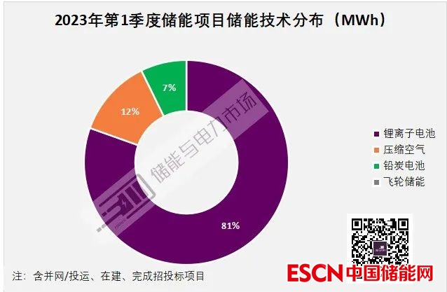 鋰離子電池仍舊是新型儲(chǔ)能中最主要的應(yīng)用技術(shù),2023年1季度,81%的裝機(jī)占比由鋰離子電池貢獻(xiàn)。