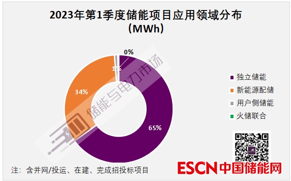 從應(yīng)用領(lǐng)域上看,2023年1季度進(jìn)入實(shí)施階段的儲(chǔ)能項(xiàng)目中,獨(dú)立式儲(chǔ)能電站占比最大,MWh占比65%。