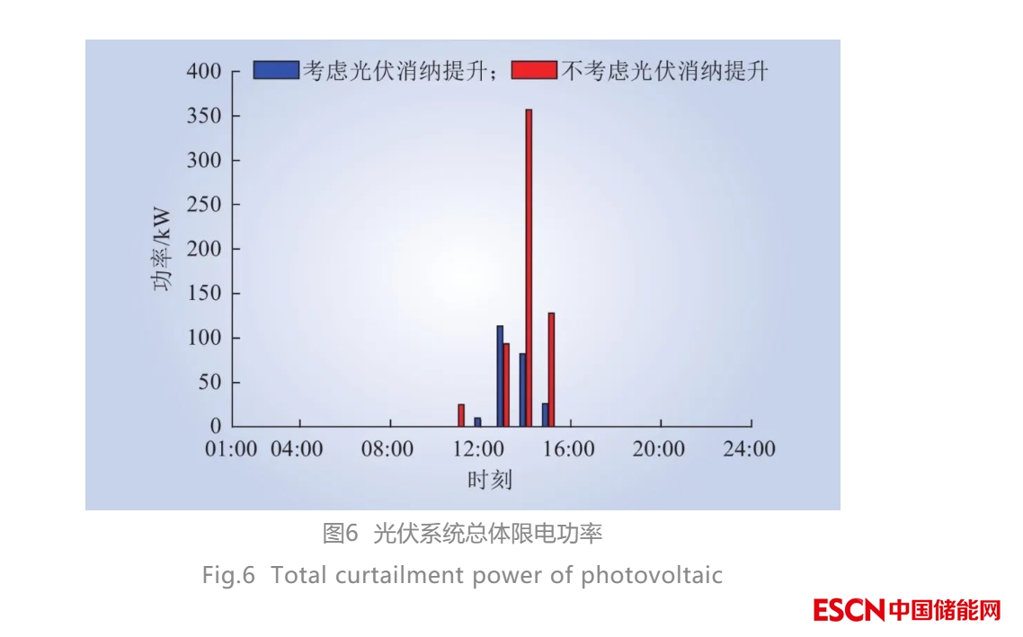 2種目標下光伏限電功率如圖6所示。當儲能考慮光伏消納提升時,光伏日限電量僅為231.7 kW·h,此時儲能日收益為376.2元。當儲能不考慮光伏消納提升時,光伏日限電量為603.4 kW·h,此時儲能日收益為475.9元。儲能不考慮光伏消納提升時,儲能收益提高了26.5%,但是限電量增加了160.4%,其社會總效益仍呈現(xiàn)了大幅降低趨勢。采用提出的儲能優(yōu)化控制模型和方法,能夠?qū)崿F(xiàn)光伏和儲能系統(tǒng)的綜合效益提升,并且降低大規(guī)模電網(wǎng)的求解難度。