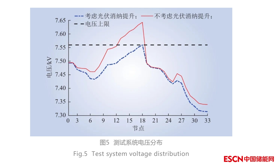 雖然解耦后儲能優(yōu)化控制模型中不包含功率和電壓約束,但經(jīng)過校驗可以看出在13:00時考慮光伏消納提升后測試系統(tǒng)的電壓完全滿足電壓安全約束,測試系統(tǒng)電壓分布如圖5所示,從而驗證了所提解耦方法的有效性。在不考慮光伏消納提升的儲能系統(tǒng)運行策略下,測試系統(tǒng)中12~18節(jié)點的電壓在13:00均超過上限。