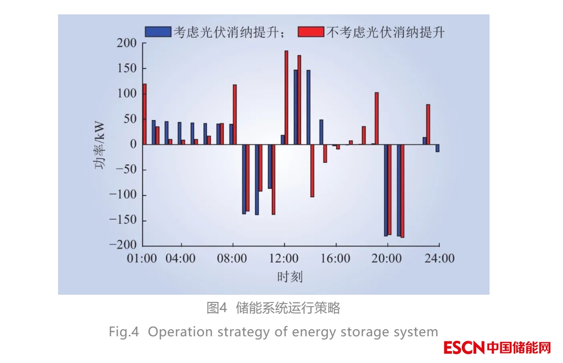 考慮與不考慮光伏消納提升的儲能系統(tǒng)運行策略如圖4所示。從圖4中可以看出,儲能運行策略在中午光伏出力高峰時段差異性較大。考慮光伏消納提升時,其優(yōu)化運行策略完全符合實際功率下限約束,說明了實際功率下限計算的合理性。不考慮光伏消納提升的儲能系統(tǒng)充、放電特性僅與電價峰谷特性緊密相關(guān),與光伏出力特性并無關(guān)聯(lián)。
