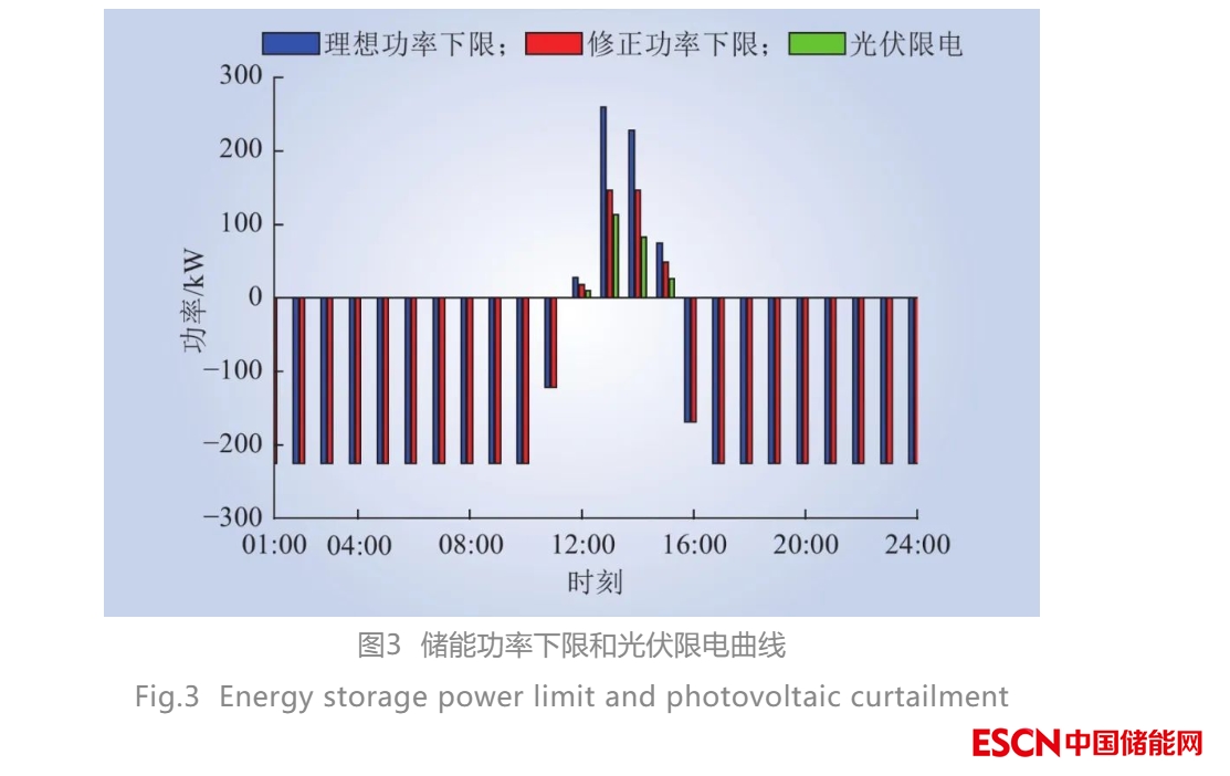 儲能系統(tǒng)功率以及光伏系統(tǒng)限電曲線如圖3所示。從圖3中可以看出,為了完全消納光伏出力,不考慮儲能系統(tǒng)約束的理想功率下限在12:00—15:00分別達到了27.9 kW、259.7 kW、228.6 kW和74.5 kW。該功率已經(jīng)超過了儲能系統(tǒng)實際運行能力,因此實際功率下限修正為18.1 kW、146.3 kW、146.3 kW和48.5 kW。修正后光伏出力無法完全消納,則理想功率下限和實際功率下限的差值分別為9.8 kW、113.4 kW、82.3 kW和26.0 kW。