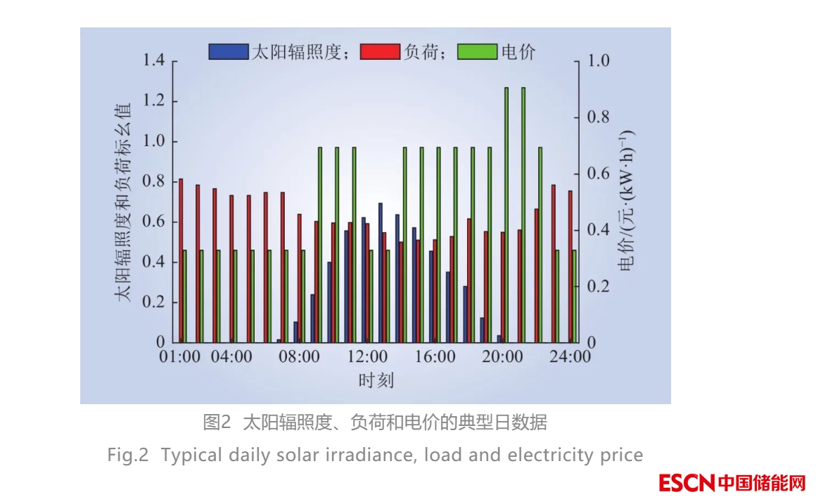 光照場景選取夏季光照曲線,太陽輻照基準值設(shè)為1 000 W/m2。負荷場景選用典型的工業(yè)負荷,負荷基值參照文獻[25]。電價數(shù)據(jù)參考某省工業(yè)分時電價。上述參數(shù)在典型日各時段數(shù)據(jù)如圖2所示。
