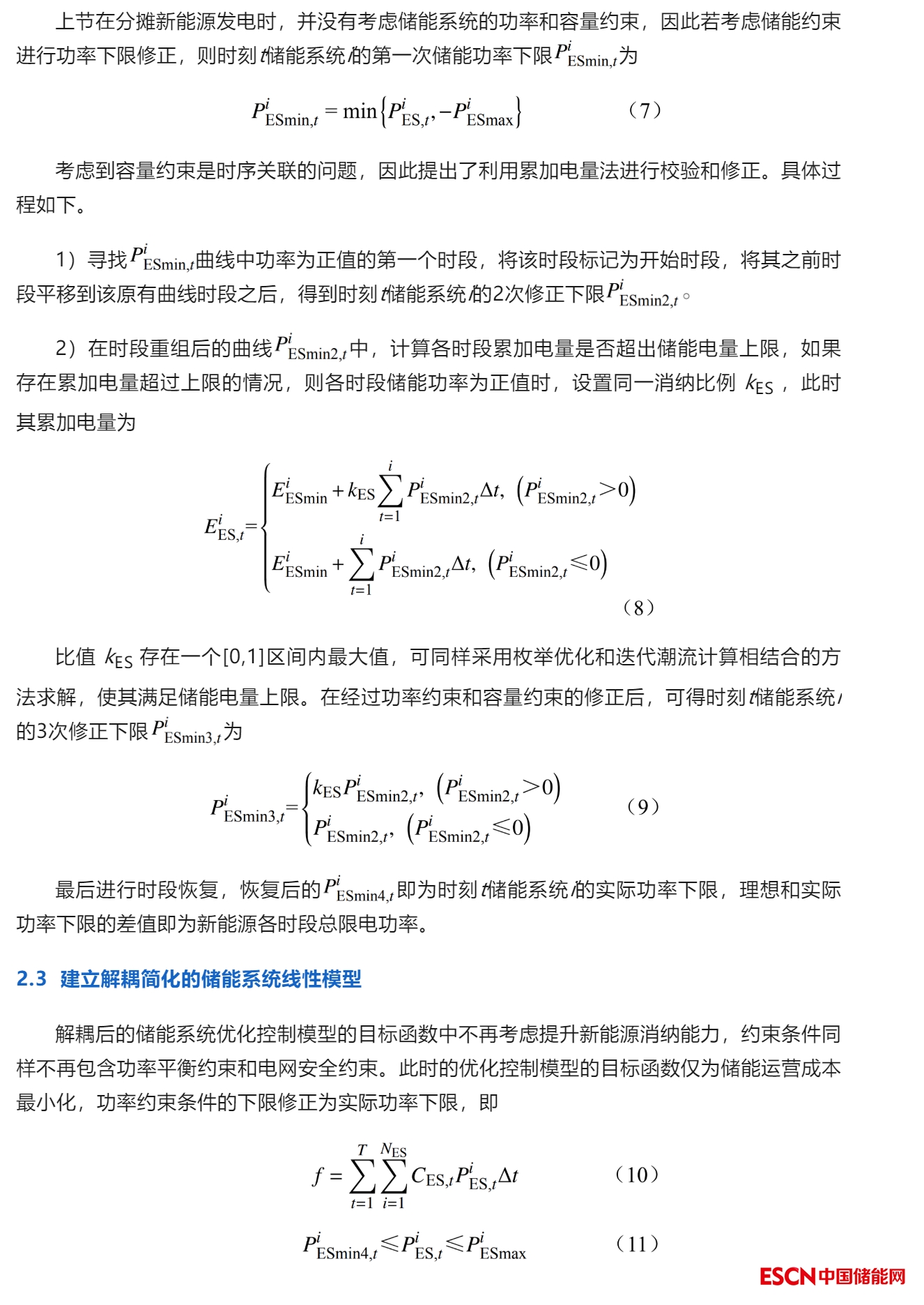 2)根據(jù)儲能系統(tǒng)的容量和功率約束,利用累加電量法和新能源整體消納比例計算修正后的充放電功率下限;