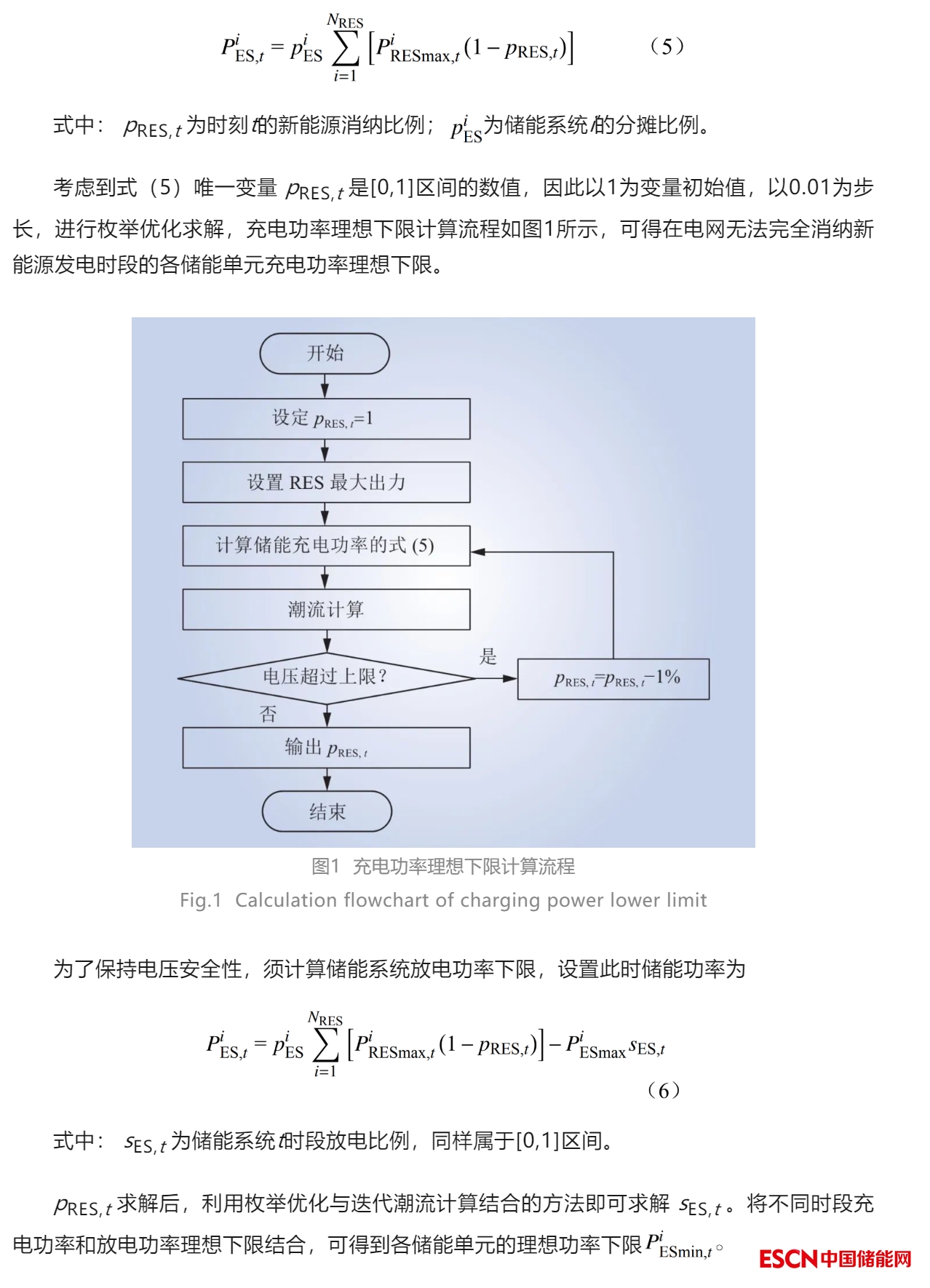 在大規(guī)模新能源并網(wǎng)場景下,特別是在配電網(wǎng)中,制約新能源消納的原因主要為負荷較小無法實現(xiàn)就地消納時,反向潮流造成局部電壓升高[22-24],從而降低了電網(wǎng)運行安全性。因此儲能運行控制模型須考慮電網(wǎng)安全性約束,并適應(yīng)新能源和儲能快速發(fā)展需求,進一步提出適應(yīng)大規(guī)模非線性優(yōu)化問題的快速穩(wěn)定的求解方法。在此背景下,本文提出了一種基于解耦的儲能參與新能源消納的優(yōu)化控制方法。該方法建立了提升新能源消納的儲能系統(tǒng)優(yōu)化控制模型。針對該非線性優(yōu)化模型的求解難題,提出了基于枚舉優(yōu)化和迭代潮流計算解耦的儲能系統(tǒng)功率的理想下限計算方法,保障了系統(tǒng)電壓運行安全約束。根據(jù)儲能系統(tǒng)的容量和功率約束進一步修正功率下限。在滿足修正后的功率約束條件下,建立解耦簡化后的儲能系統(tǒng)優(yōu)化控制的線性規(guī)劃模型,進而計算儲能優(yōu)化運行策略。