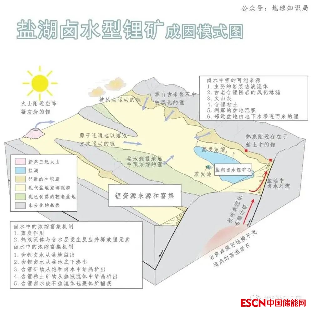 鹽湖鋰的主要來源是新生代的火山和地?zé)峄顒印5責(zé)崴畷転V地層和礦物中的鋰元素,并將其運(yùn)移,再通過火山和地?zé)嶙饔脦У降乇?,匯聚在鹽湖中。地?zé)徇€會加速水分蒸發(fā),相當(dāng)于加速鋰元素的濃縮富集。