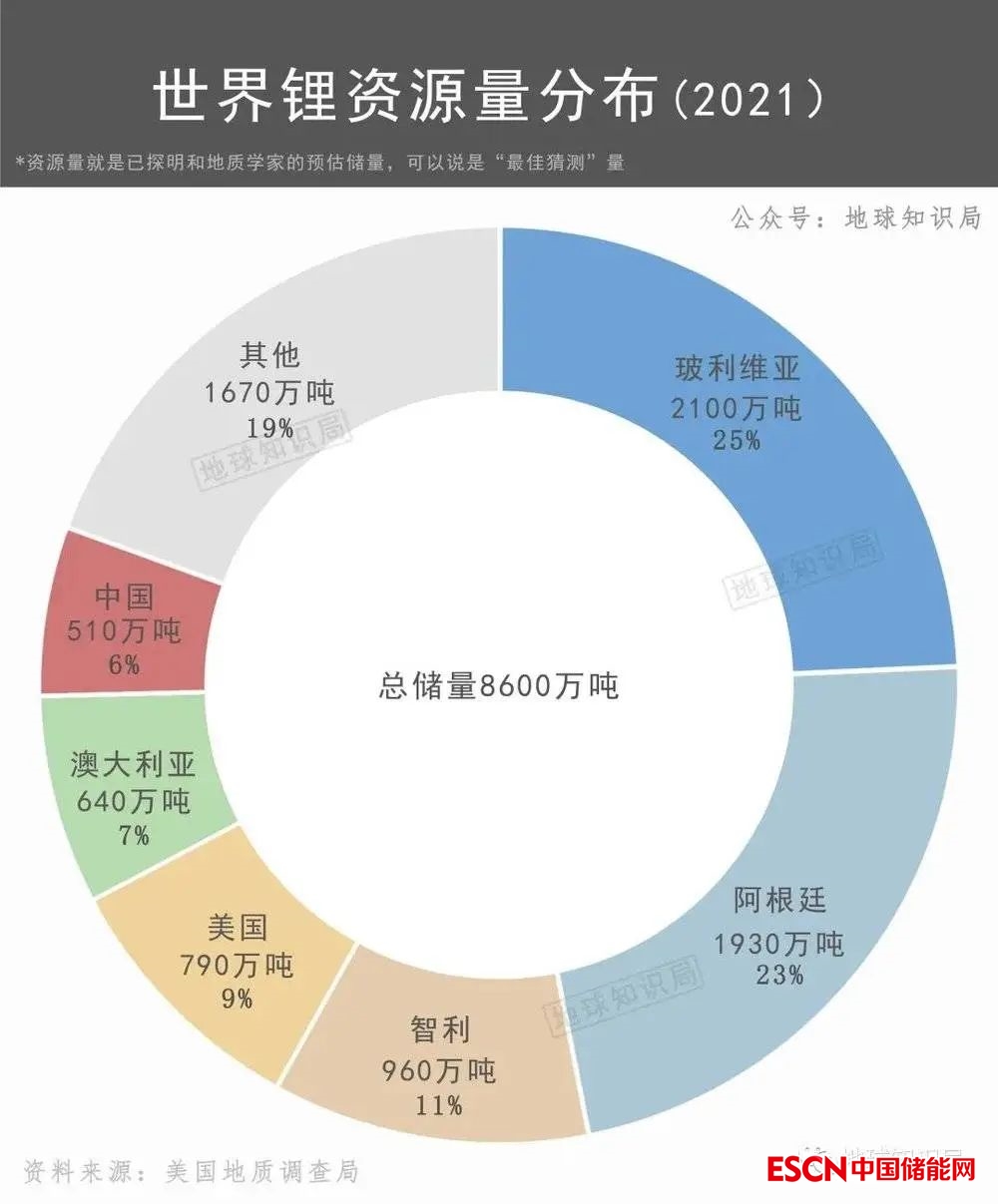 中國的鋰,從儲量來看并不算太少,根據(jù)相關(guān)統(tǒng)計數(shù)據(jù),全球鋰資源量8600萬噸,所謂資源量就是已探明的量,加上地質(zhì)學(xué)家預(yù)估的儲量,可以說是“最佳猜測值”,其中已探明儲量是2100萬噸。