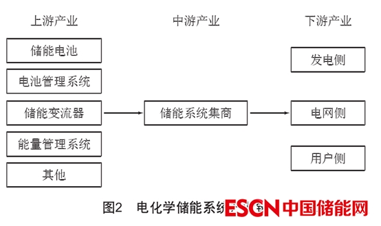 隨著電化學(xué)儲(chǔ)能技術(shù)快速發(fā)展、企業(yè)多方參與、應(yīng)用日趨完善,已經(jīng)形成了由上游產(chǎn)業(yè)、中游產(chǎn)業(yè)、下游產(chǎn)業(yè)組成的應(yīng)用產(chǎn)業(yè)鏈,具體如圖2所示。