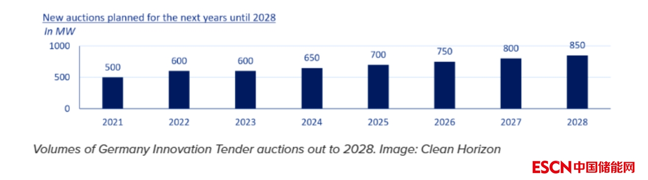 德國聯邦網絡局(Bundesnetzagentur)在2021年推出了創(chuàng)新招標,為新能源開發(fā)商提供并網能源的固定溢價,為期20年,以鼓勵可再生能源加儲能在全國的部署。這種招標將每年進行一次,預計到2028年將采購5450MW的總容量。