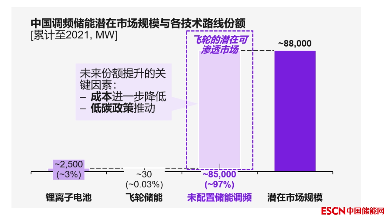 科爾尼認(rèn)為,飛輪應(yīng)用于電網(wǎng)調(diào)頻屬于高潛力的藍(lán)海市場(chǎng)。隨著技術(shù)提升,2022年以來(lái),飛輪在電網(wǎng)調(diào)頻應(yīng)用領(lǐng)域的有效成本已經(jīng)與鋰電池逐步接近,未來(lái)的市場(chǎng)競(jìng)爭(zhēng)格局有望發(fā)生變化??茽柲犷A(yù)測(cè),飛輪在中國(guó)電網(wǎng)調(diào)頻領(lǐng)域的潛在市場(chǎng)規(guī)模高達(dá)85,000MW(如圖7) 。