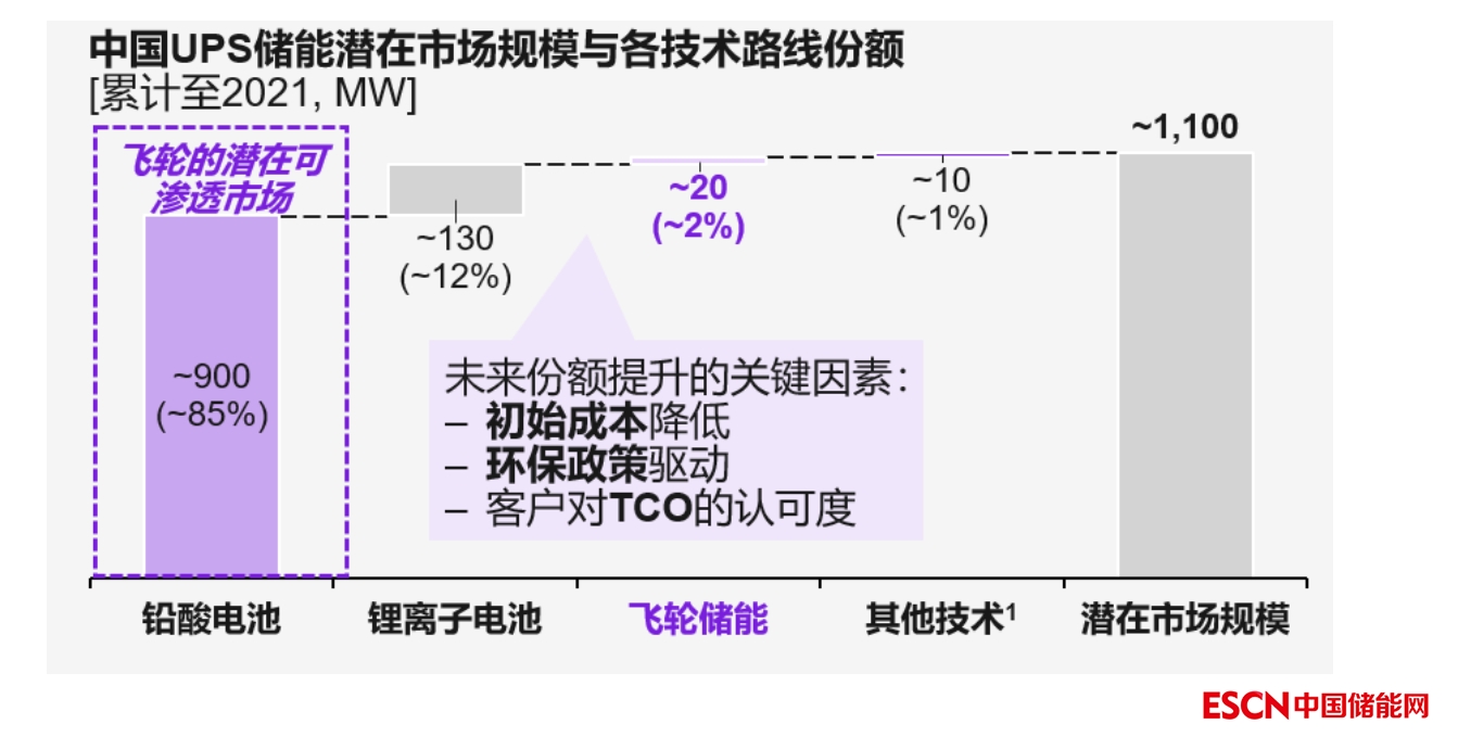 UPS不間斷電源屬于非剛需的政策引導(dǎo)型市場(chǎng)。根據(jù)飛輪儲(chǔ)能在高端醫(yī)療、高端制造業(yè)、大型數(shù)據(jù)中心和電源車(chē)四個(gè)應(yīng)用場(chǎng)景的潛力預(yù)判,預(yù)計(jì)飛輪在UPS不間斷電源的潛在市場(chǎng)規(guī)模可達(dá)約900MW,而目前的市場(chǎng)份額僅為2%(如圖 6)。飛輪在該場(chǎng)景下市場(chǎng)份額提升的關(guān)鍵因素包含初始成本的降低、客戶(hù)對(duì)TCO的認(rèn)可度的提升、以及最重要的環(huán)保政策驅(qū)動(dòng)。