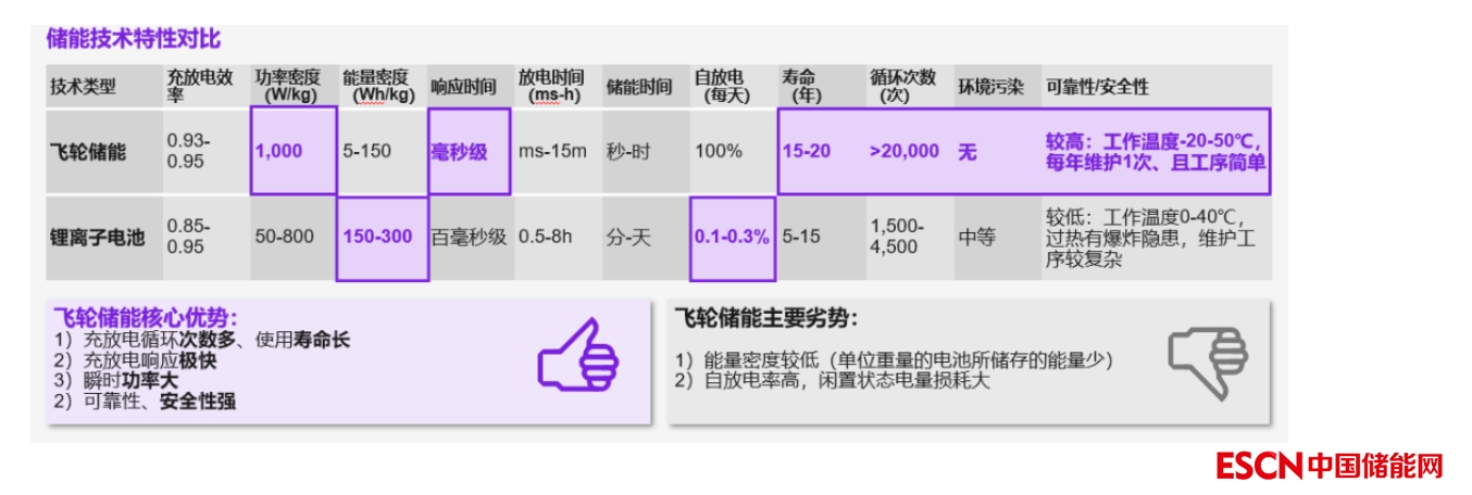 相比市場(chǎng)主流的鋰電池,飛輪儲(chǔ)能在循環(huán)次數(shù)、瞬時(shí)功率、響應(yīng)速度、安全性等方面優(yōu)勢(shì)突出,但也存在能量密度低、自放電率高的劣勢(shì)(如圖3)。