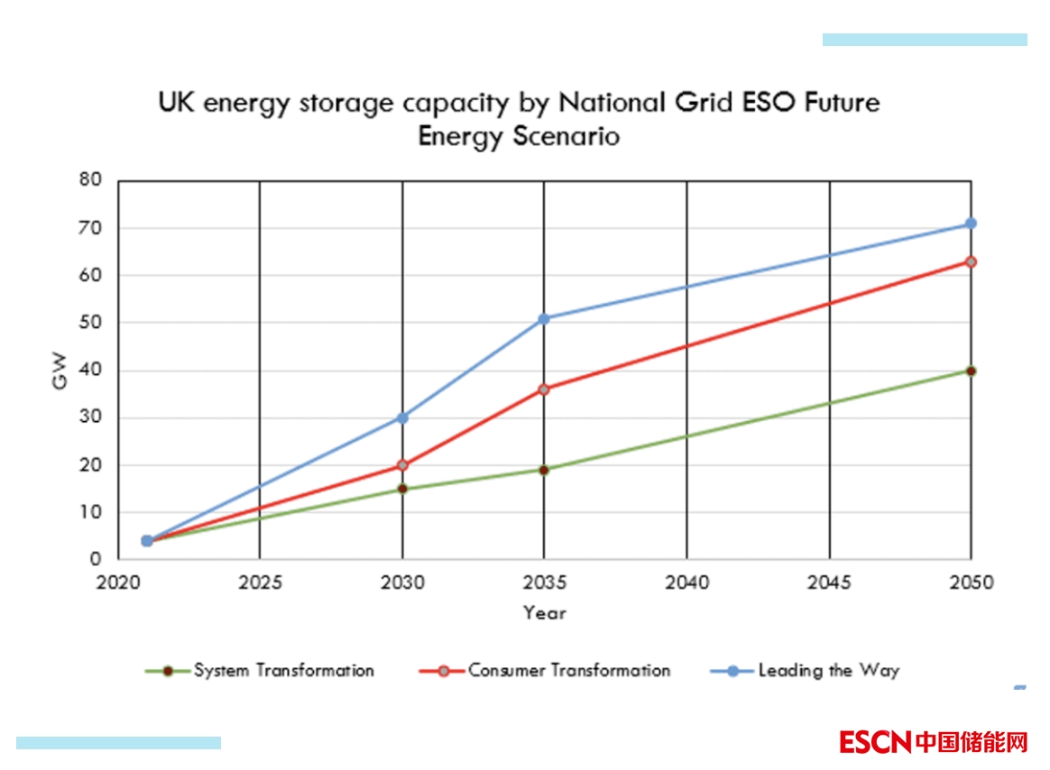 因此,英國需要在未來二十年內(nèi)迅速擴(kuò)大和部署儲能裝機(jī),以替代天然氣目前的作用,才能實(shí)現(xiàn)零排放。英國目前的儲能容量僅為2.4吉瓦左右,但電力系統(tǒng)運(yùn)營商國家電網(wǎng)ESO根據(jù)其未來能源需求情景估計,到2030年儲能裝機(jī)至少需要達(dá)到15吉瓦,到2050年至少需要40吉瓦,才能實(shí)現(xiàn)2050年的凈零排放目標(biāo)。