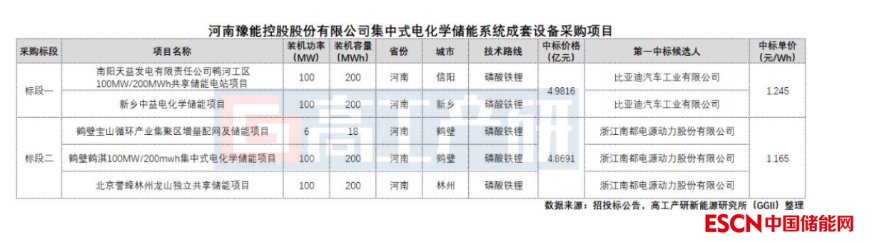 其中,河南省項(xiàng)目主要是河南豫能控股股份有限公司發(fā)布集中式電化學(xué)儲(chǔ)能系統(tǒng)成套設(shè)備采購(gòu)中標(biāo)項(xiàng)目。該中標(biāo)項(xiàng)目涉及包含5個(gè)集中式電化學(xué)儲(chǔ)能系統(tǒng)成套設(shè)備采購(gòu),儲(chǔ)能總規(guī)模406MW/818MWh,項(xiàng)目地點(diǎn)位于鶴壁、新鄉(xiāng)、南陽(yáng)、林州四市。該項(xiàng)目一標(biāo)段第一中標(biāo)候選人為比亞迪汽車工業(yè)有限公司,中標(biāo)報(bào)價(jià)49816萬(wàn)元,中標(biāo)單價(jià)單價(jià)1.245元/Wh;二標(biāo)段第一中標(biāo)候選人為浙江南都電源動(dòng)力股份有限公司,中標(biāo)報(bào)價(jià)48691萬(wàn)元,折合單價(jià)1.165元/Wh。