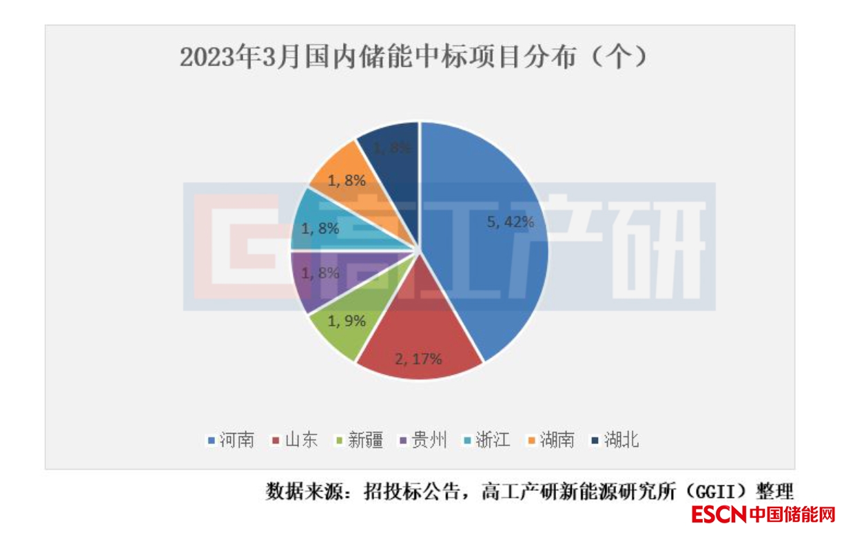 3月儲(chǔ)能中標(biāo)項(xiàng)目主要分布在河南、山東兩省,占據(jù)本月一半數(shù)目,分別釋放0.8GWh和0.2GWh。