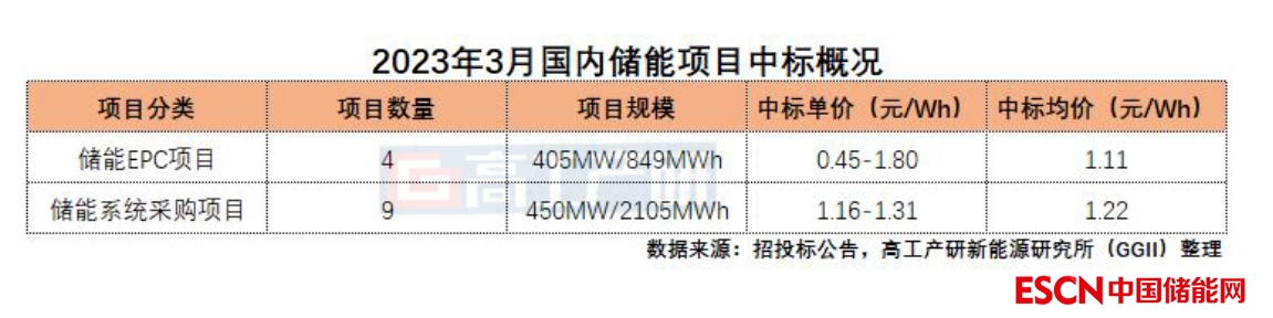 3月,國(guó)內(nèi)儲(chǔ)能項(xiàng)目EPC總承包報(bào)價(jià)在0.45-1.80元/Wh之間,均價(jià)為1.11元/Wh。本月儲(chǔ)能EPC中標(biāo)價(jià)最高的是華能辛店發(fā)電有限公司100兆瓦/200兆瓦時(shí)儲(chǔ)能項(xiàng)目,由北京海博思創(chuàng)科技股份有限公司中標(biāo),單價(jià)約為1.80元/Wh。