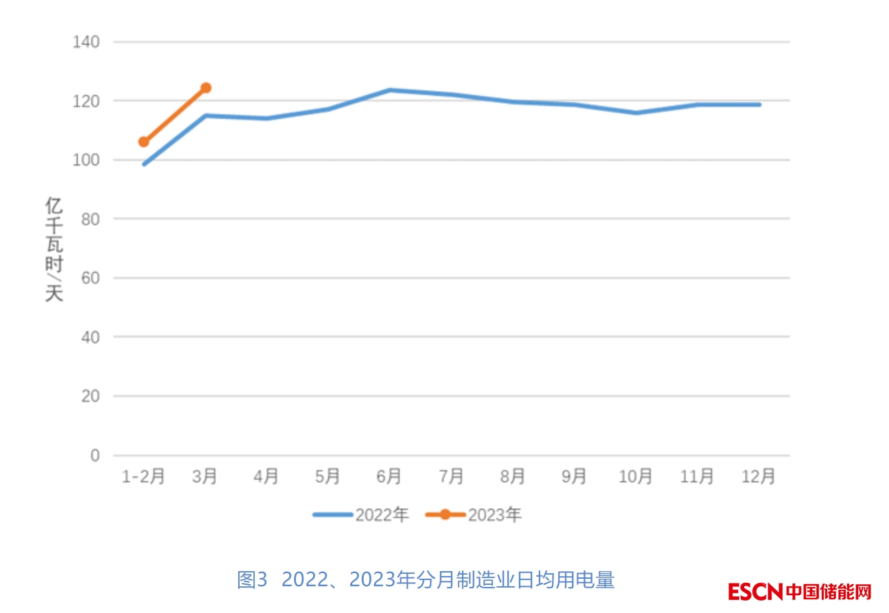 3月份,全國制造業(yè)用電量3855億千瓦時,同比增長7.4%;制造業(yè)日均用電量124.4億千瓦時/天,比上年同期增加9.5億千瓦時/天,比上月增加5.3億千瓦時/天。其中,四大高載能行業(yè)用電量合計2070億千瓦時,同比增長6.1%;高技術(shù)及裝備制造業(yè)用電量842億千瓦時,同比增長10.8%;消費品制造業(yè)用電量500億千瓦時,同比增長5.0%;其他制造業(yè)行業(yè)用電量443億千瓦時,同比增長9.4%。
