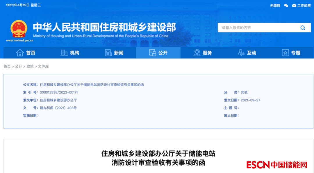 中國(guó)儲(chǔ)能網(wǎng)訊:4月18日,住建部公布回復(fù)廣東住建廳《關(guān)于明確儲(chǔ)能電站消防設(shè)計(jì)審查驗(yàn)收有關(guān)事項(xiàng)的請(qǐng)示》的函。