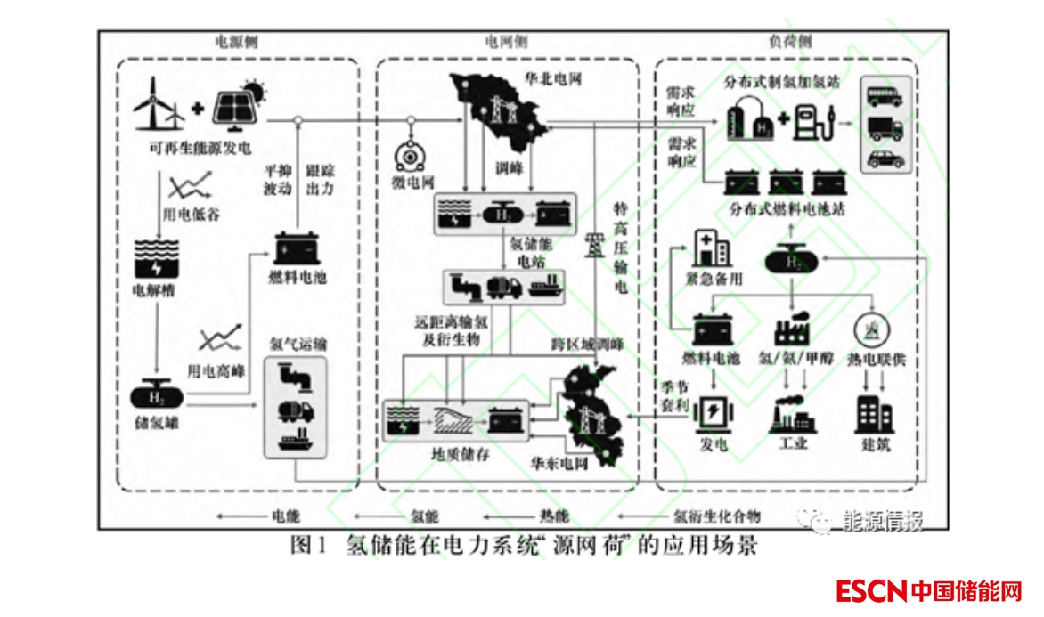 氫儲能分為廣義和狹義兩種,廣義的氫儲能體系是指把電能、化學(xué)能等任意形式的能量轉(zhuǎn)換成氫氣的化學(xué)能,并廣泛應(yīng)用于交通、工業(yè)、建筑、發(fā)電等應(yīng)用場景;狹義的氫儲能體系是“電—氫—電”的轉(zhuǎn)換,是指將分布式可再生能源電力或電網(wǎng)中過剩的電力,通過電解水制氫轉(zhuǎn)換成氫氣的化學(xué)能,隨后利用氫氣發(fā)電技術(shù)將氫能再次轉(zhuǎn)換為電力并輸送回電網(wǎng),或運輸至用戶端進行分布式發(fā)電,通常僅限于發(fā)電領(lǐng)域的應(yīng)用。本文所討論的氫儲能,主要指狹義的氫儲能。