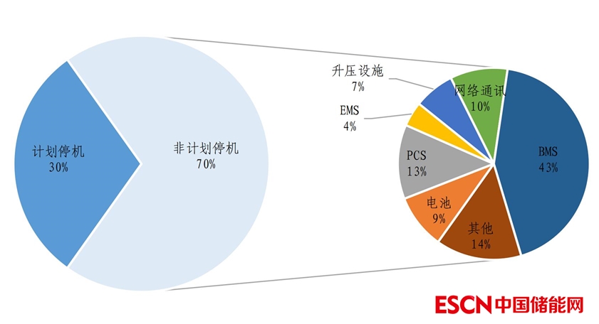 三是關鍵產(chǎn)品質(zhì)量有待加強。雖然2022年電化學儲能平均轉(zhuǎn)換效率為81.06%,但是各地、各企業(yè)間差距較大,最高為92.51%,最低為33.91%,從投運時間段來看,投產(chǎn)1年內(nèi)的平均轉(zhuǎn)換效率為80.53%,5年以上的平均轉(zhuǎn)換效率為60.86%,反映出電池產(chǎn)品整體質(zhì)量還不十分成熟穩(wěn)定。2022年,全年非計劃停運671次,單位能量非計劃停運次數(shù)為24.45次/100MWh,相比2022年火電機組的非計劃停運次數(shù)0.35次/(臺?年),差距較大。電池管理系統(tǒng)(BMS)異常是電化學儲能電站非計劃停運的主要原因,停運次數(shù)占比43%,儲能變流器(PCS)、電池等電站關鍵設備異常導致的非計劃停運,單次平均停運時長最長,分別為60.98h、55.74h。