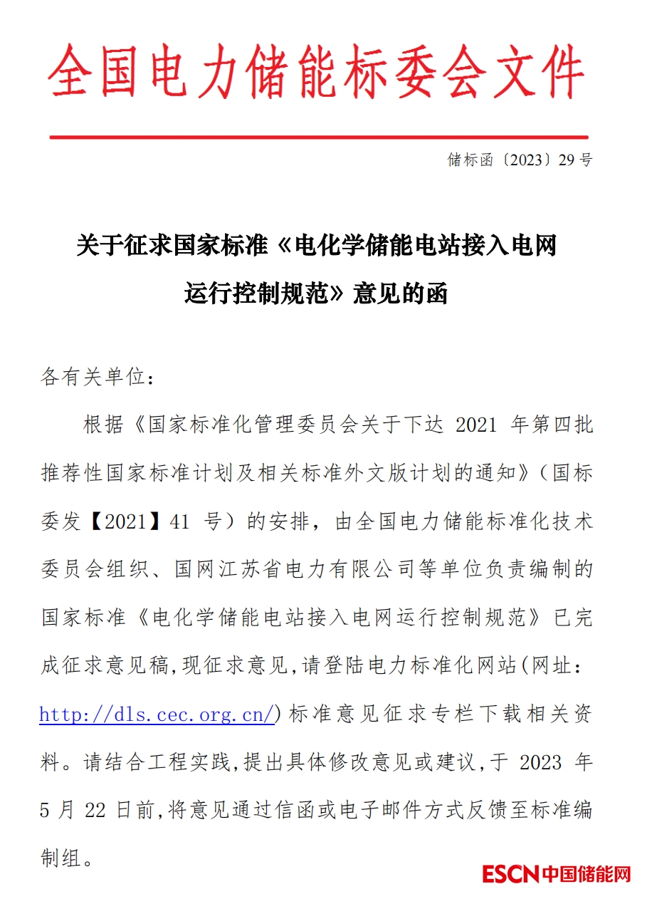 關(guān)于征求國家標(biāo)準(zhǔn)《 電化學(xué)儲(chǔ)能電站接入電網(wǎng)運(yùn)行控制規(guī)范》意見的函