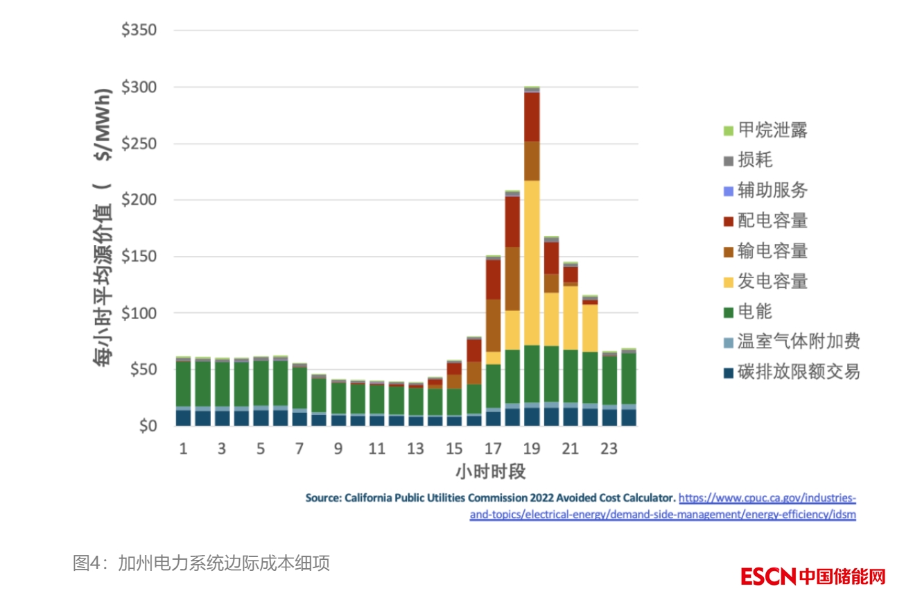 上面列出的這些邊際成本是整個北美電力系統(tǒng)最常使用的類別。但是,適用于各個電力系統(tǒng)的具體邊際成本類別可能有所不同。將各類邊際成本加在一起,就可產生總的邊際成本。圖4顯示了加州的一項計算結果。需要注意的是,這個每日輪廓圖代表了所有季節(jié)的平均值,而每個季節(jié)的數(shù)值可能有高有低。