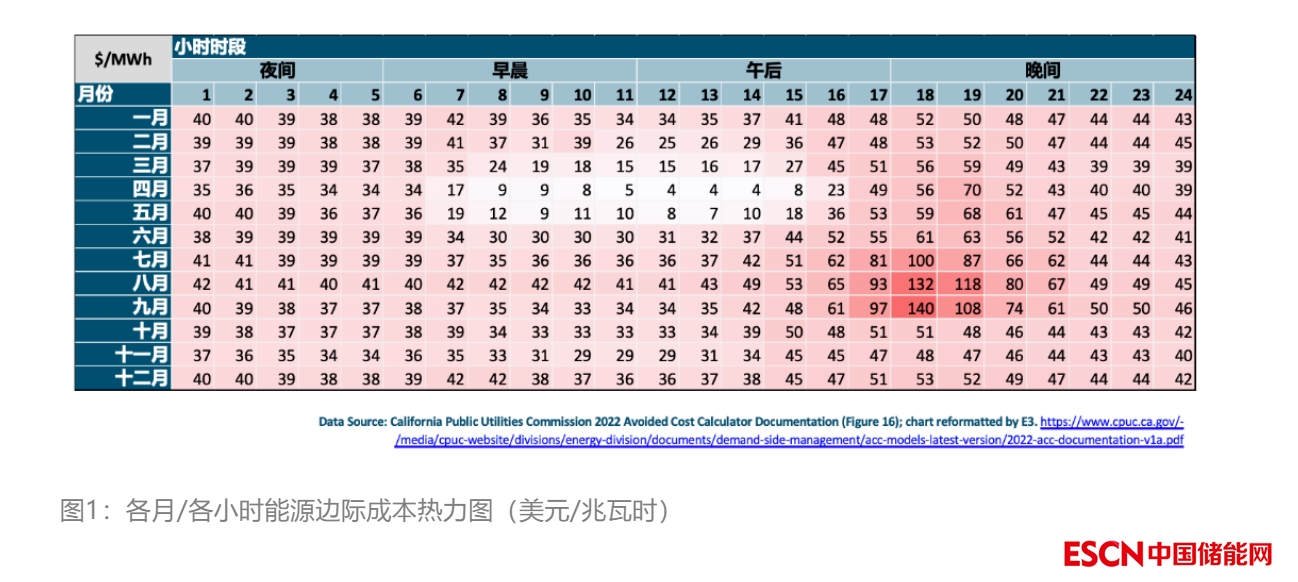 計算電能量的邊際成本有多種方法,其中一種是生產模擬模型,它可以在特定的約束條件下(如發(fā)電機組和輸電限制),以最小成本(即經(jīng)濟最優(yōu))的方式,模擬每小時(甚至每幾十分鐘)電力系統(tǒng)的運行情況。這些數(shù)據(jù)可以匯總為每個月各小時的平均值,以體現(xiàn)經(jīng)常出現(xiàn)的每日和季節(jié)性模式,并看出邊際成本在何時更高。下圖顯示了美國加州采用生產模擬模型計算的結果。