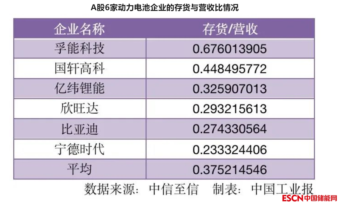 數(shù)據(jù)顯示,目前孚能科技的庫存與營業(yè)收入的比值為67.6%,國軒高科的庫存與營業(yè)收入的比值為44.85%,億緯鋰能的庫存與營業(yè)收入的比值為32.59%,欣旺達的庫存與營業(yè)收入的比值為29.32%,比亞迪的庫存與營業(yè)收入的比值為27.43%,寧德時代的庫存與營業(yè)收入的比值為23.33%。上述6家公司的庫存與營業(yè)收入的比值平均為37.52%。