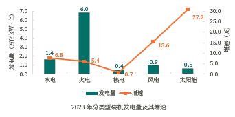 全國發(fā)電量穩(wěn)步增長,火電發(fā)電量比重持續(xù)下降。2023年,預(yù)計全國發(fā)電量為9.3萬億千瓦時,比上年增長7.2%。其中,水電、火電、核電、風(fēng)電、太陽能發(fā)電量占比分別為15.5%、64.8%、4.5%、9.3%、5.8%,較上年分別變化-0.1、-1.1、-0.3、0.5、0.9個百分點,對發(fā)電增長的貢獻(xiàn)率分別為14.8%、49.3%、0.5%、16.7%、18.7%。預(yù)計全國發(fā)電設(shè)備平均利用小時數(shù)為3651小時,比上年下降約37小時,其中,水電、火電利用小時數(shù)比上年分別上升138、55小時,核電、風(fēng)電、太陽能利用小時數(shù)比上年分別減少約66、11、27小時。