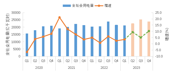 分季度看,預(yù)計2023年各季度全國全社會用電量增速分別為3.6%、9.4%、5.1%、10.3%,受上年基數(shù)影響,第二、四季度用電增速顯著高于第一、三季度用電增速。