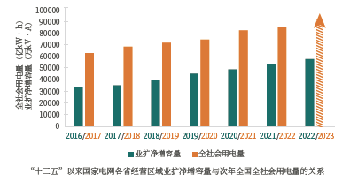 業(yè)擴(kuò)凈增容量較快增長,為用電增長提供有力支撐。2022年,國家電網(wǎng)公司經(jīng)營區(qū)域累計完成業(yè)擴(kuò)凈增容量5.8億千伏安,比上年增長9.1%。根據(jù)歷年業(yè)擴(kuò)凈增容量與次年全國全社會用電量的關(guān)系,2023年全國全社會用電量有望保持良好的增長態(tài)勢。