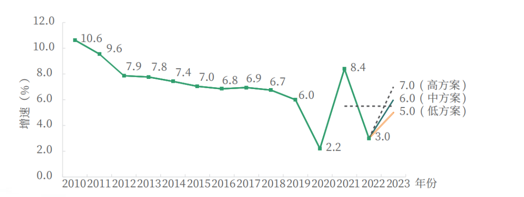 宏觀經(jīng)濟(jì)方面,受地緣政治事件和金融風(fēng)險上升拖累,全球經(jīng)濟(jì)增速進(jìn)一步放緩。疫情防控措施加快優(yōu)化調(diào)整,疫情對經(jīng)濟(jì)的影響將顯著減??;存量、增量宏觀政策疊加發(fā)力,加之基數(shù)效應(yīng)明顯,預(yù)計2023年我國經(jīng)濟(jì)運行有望整體明顯好轉(zhuǎn)。考慮國際經(jīng)濟(jì)、疫情形勢、房地產(chǎn)政策效果等不確定因素設(shè)置高、中、低三個方案對經(jīng)濟(jì)進(jìn)行預(yù)測,預(yù)計2023年GDP分別增長5.0%、6.0%、7.0%,兩年平均增速分別為4.0%、4.5%、5.0%。中方案下,三次產(chǎn)業(yè)增速分別為5.0%、5.9%和6.3%,四個季度GDP增速分別為4.5%、8.1%、5.5%、6.0%,兩年平均增速分別為4.6%、4.2%、4.7%、4.8%。