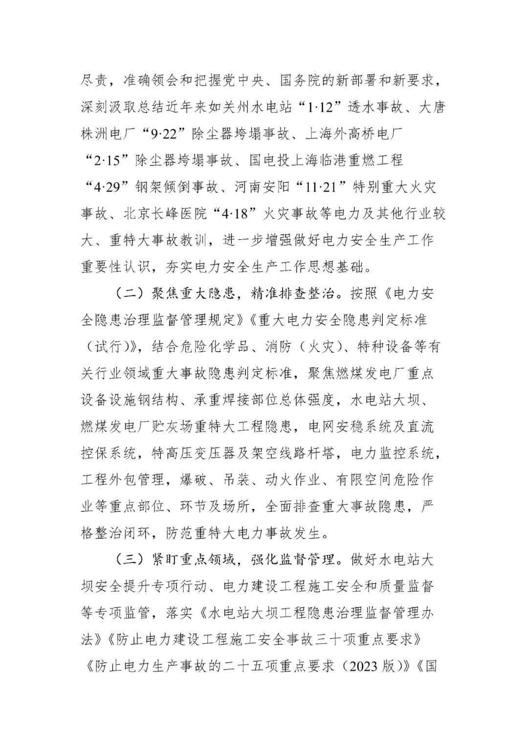 為認(rèn)真貫徹落實(shí)黨的二十大精神和習(xí)近平總書記關(guān)于安全生產(chǎn)重要論述,按照黨中央、國務(wù)院決策部署,進(jìn)一步落實(shí)國務(wù)院安全生產(chǎn)委員會全體會議有關(guān)部署,按照國務(wù)院安委會《全國重大事故隱患專項(xiàng)排查整治2023行動總體方案》各項(xiàng)工作要求,從即日起開展全國電力安全生產(chǎn)重大事故隱患專項(xiàng)排查整治2023行動?,F(xiàn)將方案印發(fā)給你們,請結(jié)合實(shí)際認(rèn)真抓好落實(shí)。
