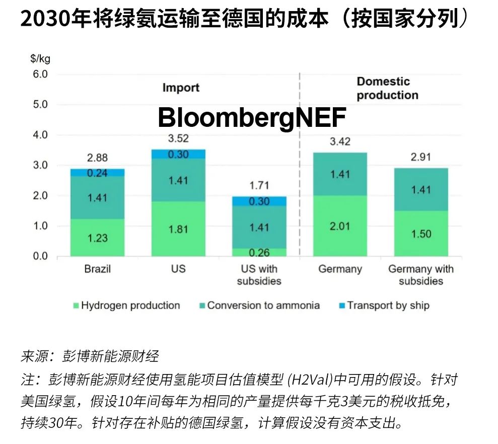 得益于預(yù)期較低的平準(zhǔn)化制氫成本,該地區(qū)的綠氫項(xiàng)目可能滿足歐洲和亞洲的需求。彭博新能源財(cái)經(jīng)預(yù)計(jì),從巴西向德國(guó)出口綠氨(NH3)可能與德國(guó)的補(bǔ)貼產(chǎn)量相競(jìng)爭(zhēng)。
