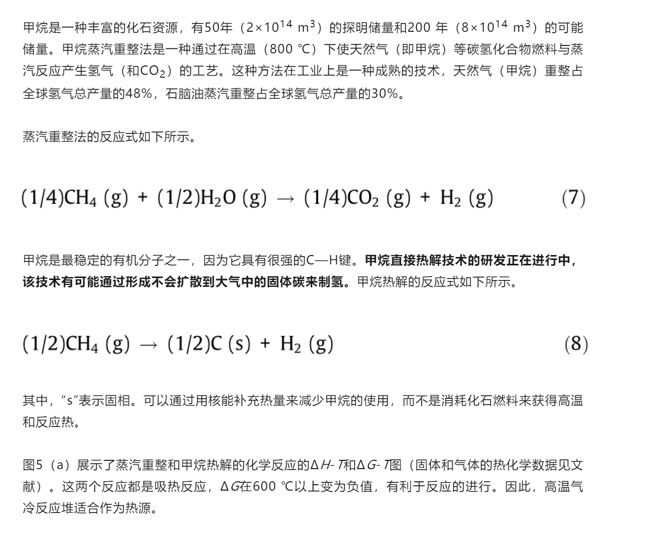 圖5(b)顯示了利用核熱能將甲烷轉(zhuǎn)化為氫氣的能量轉(zhuǎn)換圖。甲烷的?效比約為0.9。通過在甲烷中加入?效比約為0.5的核熱能,可以得到焓值為286 kJ、?為237 kJ的氫氣。