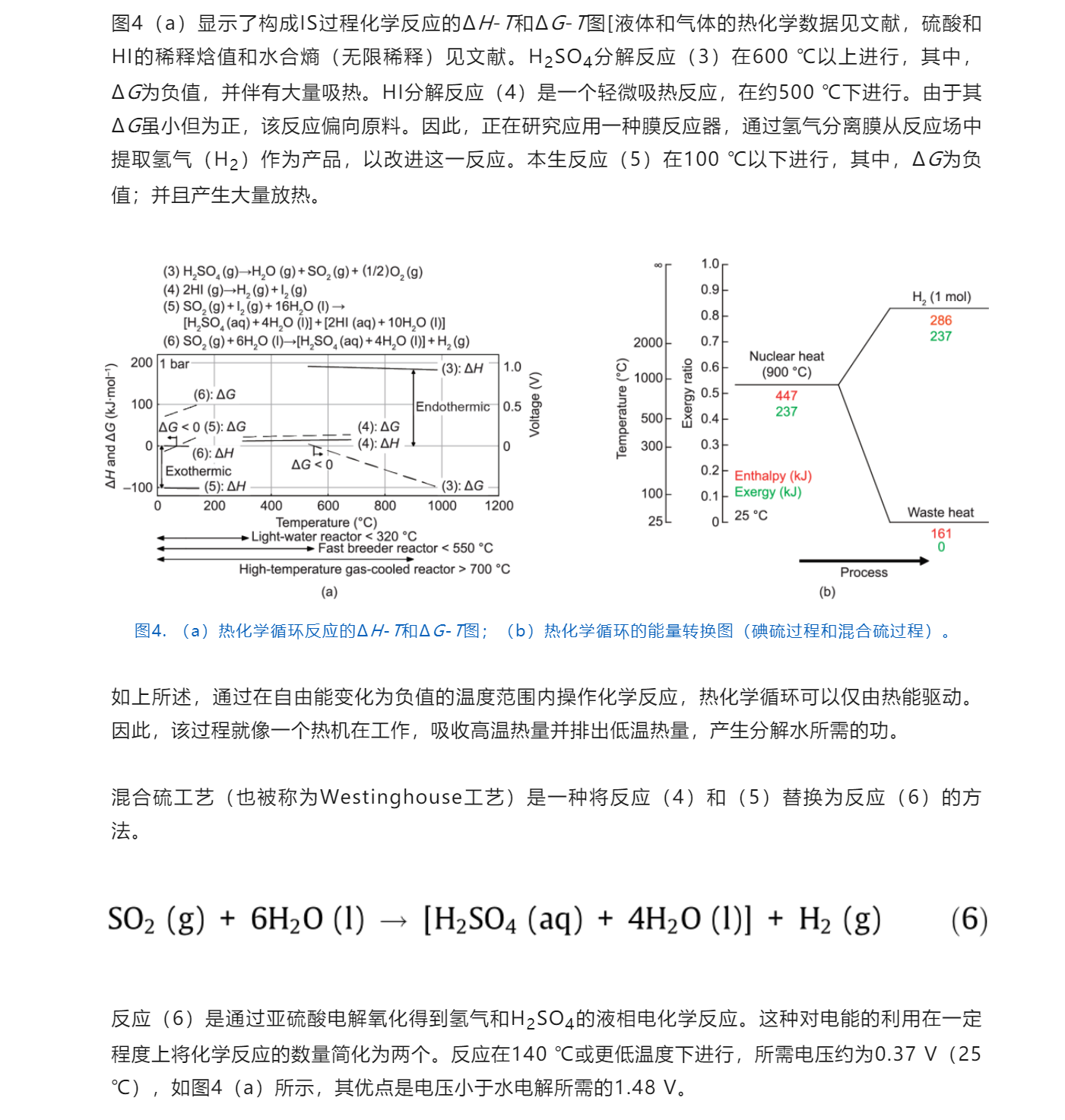 圖4(b)是用熱化學循環(huán)將核熱能轉(zhuǎn)化為氫能的能量轉(zhuǎn)換圖。原則上,1 mol的氫氣可以從447 kJ的熱量(900 ℃)中獲得。通過耗盡近一半約0.5(900 ℃)?效比的核熱能,可以將核熱能轉(zhuǎn)化為具有約0.8高?效比的氫能。