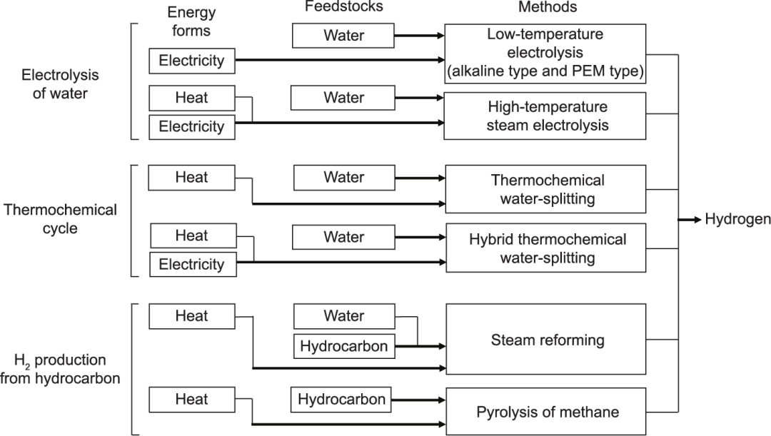 圖1展示了利用核能制氫所涉及的能量形式轉(zhuǎn)換。作為二次能源,氫氣可以通過將水或碳氫化合物(化石資源)作為原料加入核能(一次能源)來生產(chǎn)。也就是說,這個過程將核能轉(zhuǎn)化為氫氣的化學能。產(chǎn)生熱能的核反應(yīng)堆包括以下反應(yīng)堆類型,每個反應(yīng)堆的熱能可用溫度從低到高排序:輕水反應(yīng)堆(冷卻劑:水);快中子增殖反應(yīng)堆(冷卻劑:鈉),以及高溫氣冷反應(yīng)堆(冷卻劑:氦氣)。