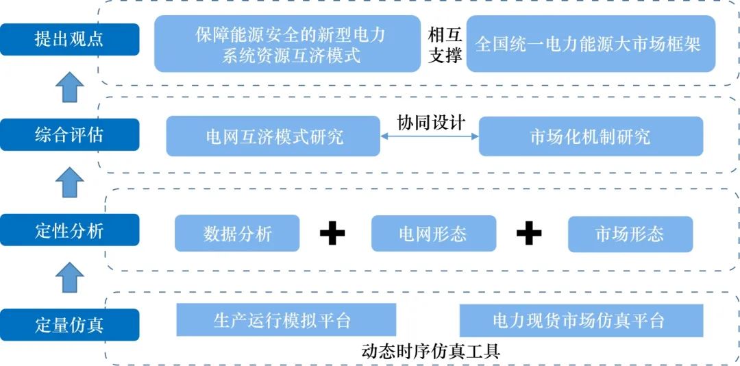 在資源配置模式方面,采取定量仿真、定性分析、綜合評估等方式,根據(jù)生產(chǎn)運行模擬平臺、電力現(xiàn)貨市場仿真平臺的結果,融合電網(wǎng)形態(tài)及市場形態(tài)數(shù)據(jù)分析,論證形成新型能源體系下電網(wǎng)互濟模式及相應的市場支撐機制,從而構建新型電力系統(tǒng)資源互濟模式、全國統(tǒng)一電力能源大市場框架相互支撐的大范圍共享互濟體系。