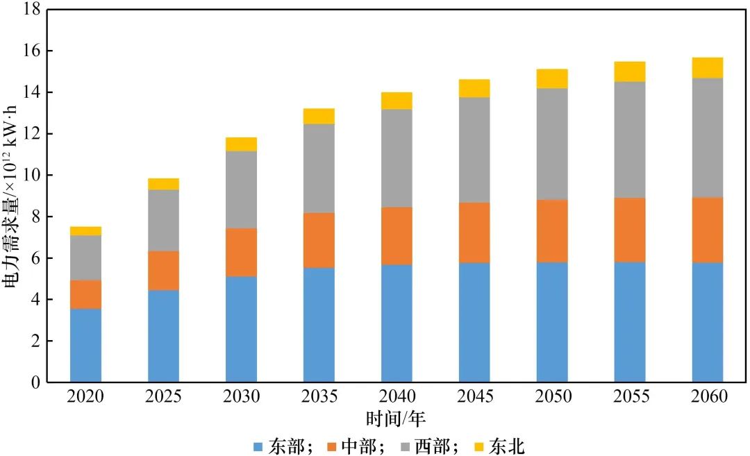 圖2 我國(guó)部分地區(qū)電力需求增長(zhǎng)趨勢(shì)(2020—2060年)