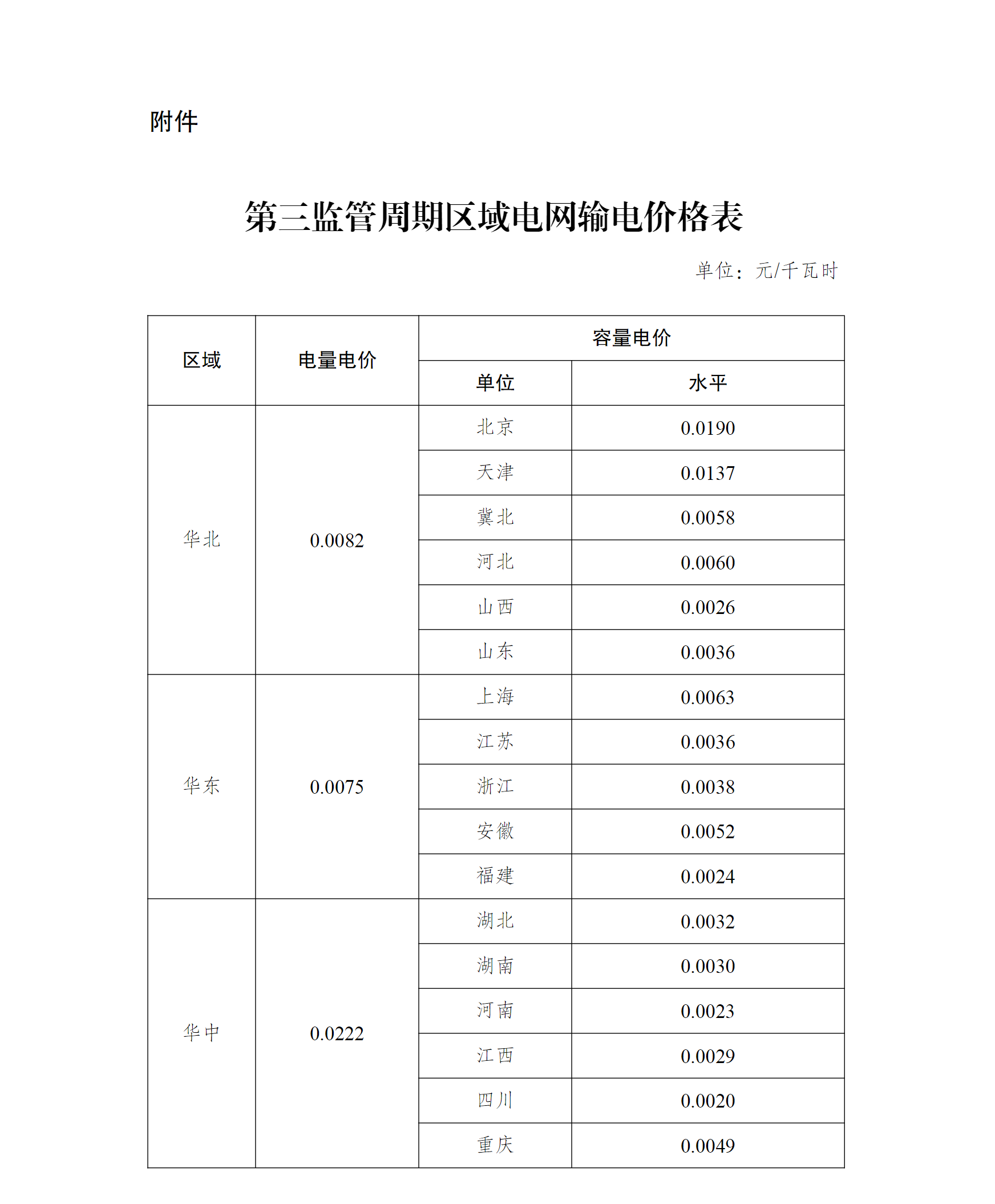 附件:第三監(jiān)管周期區(qū)域電網(wǎng)輸電價格表