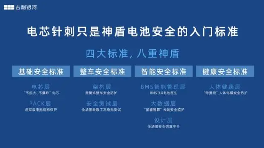 這一在業(yè)內被公認為高難度的測試,在吉利的評估體系中卻僅僅是入門級的標準。吉利的自我超越也不斷的倒逼整個行業(yè)標準的提高,刷新著汽車電池安全領域的新紀錄,其首創(chuàng)的安全新標準從電芯、PACK結構到整車架構層層升級,打造全場景“不起火,不爆炸”的超級安全電池,期間共進行100+項電池包級測試,比國標多80+項。