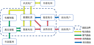 當風光電力充裕,超出數(shù)據(jù)中心用電需求的季節(jié),可利用多余電力電解水制氫,并進行跨季節(jié)儲存;當風光電力不足時,利用儲存的氫氣通過氫燃料電池設備發(fā)電,補足電力缺口,而發(fā)電的副產(chǎn)品水可回收利用,再次用于電解制氫??梢园l(fā)現(xiàn),只要合理的設計匹配風光電廠及制氫、儲氫設備的容量,理論上就可以實現(xiàn)該微電網(wǎng)的“零”碳排、“零”電費的閉環(huán)供電,若考慮數(shù)據(jù)機房及氫能電站的余熱回收利用,并向外輸出冷熱源,在獲得經(jīng)濟收益的同時,還可生產(chǎn)“負碳”,達到償還企業(yè)歷史碳足跡的目的,但該方案涉及大規(guī)模電力設施投資,其經(jīng)濟性及可靠性尚待研究。