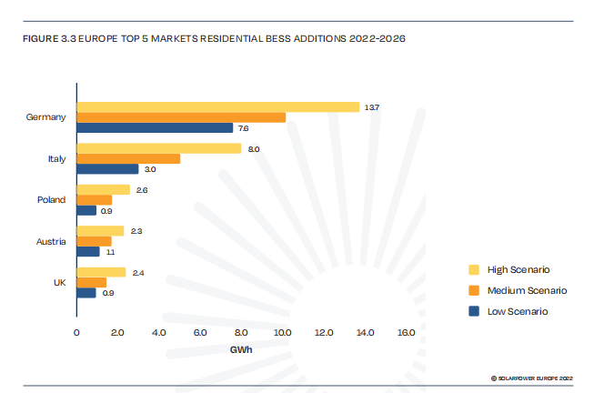 市場分布上看,2022-2026年,德國仍將是戶儲領域無可爭議的領導者,意大利緊隨其后,但還有一段距離。
