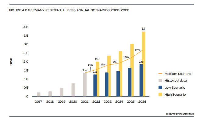 在中期情景下,2022年,德國新增裝機預計為1.5GWh,增速為14%。主要是由于安裝人員的缺乏和目前產(chǎn)品的不可用性造成的瓶頸阻礙了更大的增長。